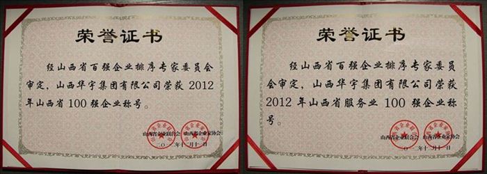 華宇集團(tuán)榮獲“2012山西企業(yè)100強”第48名和“2012山西服務(wù)企業(yè)100強”第14名。